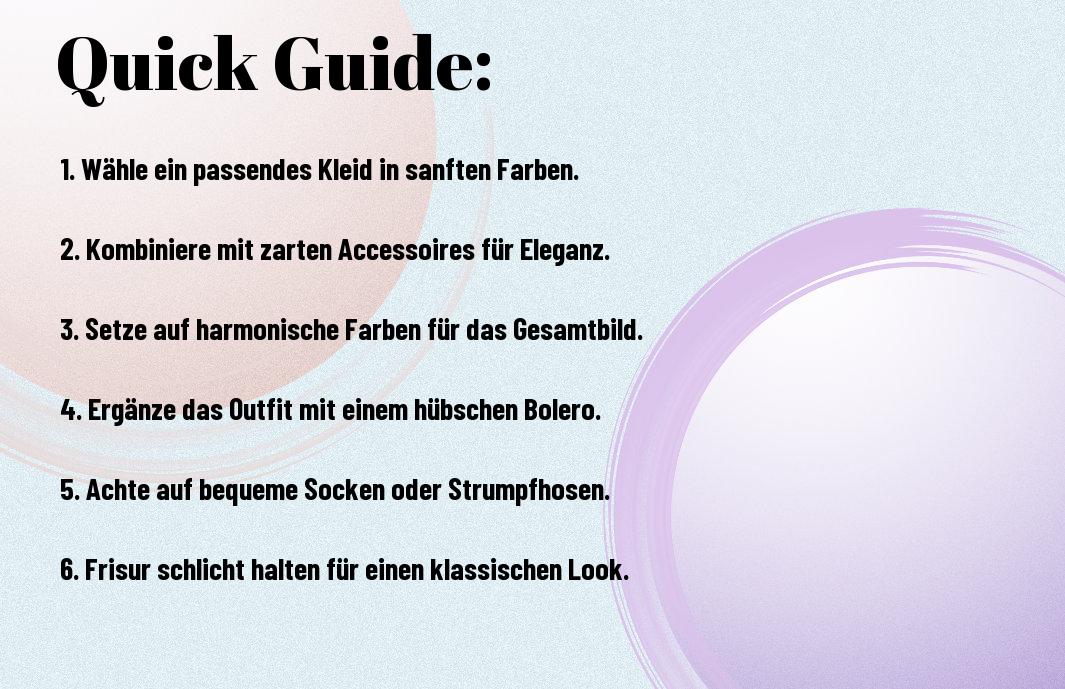 Um Ihre weißen Kommunionschuhe stilvoll zu integrieren, sollten Sie die Farbe Ihres Kleides berücksichtigen. Helle, pastellfarbene Kleider harmonieren besonders gut mit weißen Schuhen, während kräftige Farben durch die Schuhe aufgefrischt werden können. Achten Sie darauf, dass die Farbtöne einander ergänzen, um ein elegantes Gesamtbild zu erzielen und den Look zu perfektionieren.